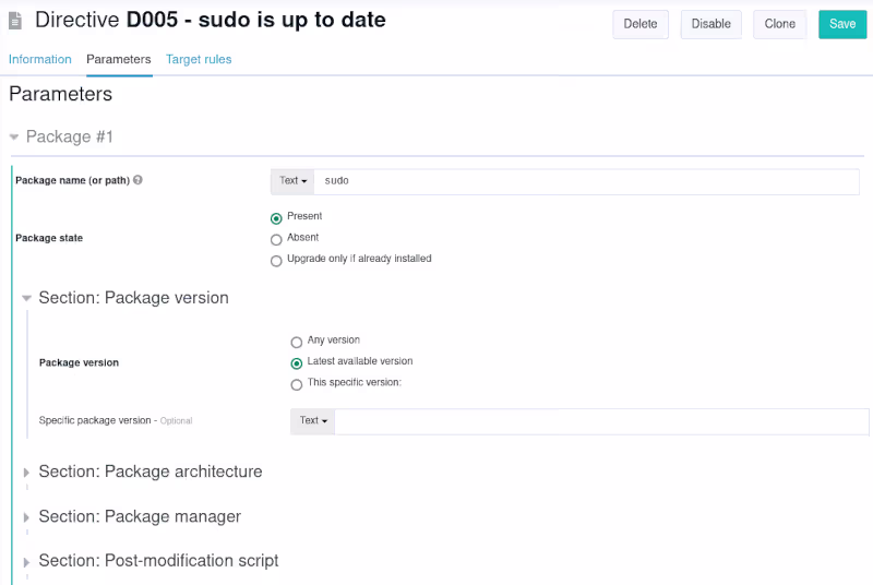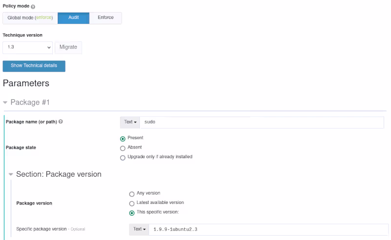 Si on veut faire ça, il suffit de positionner la directive sur “Audit”, et utiliser l’option “This specific version” plutôt que “Latest available version”.