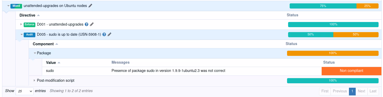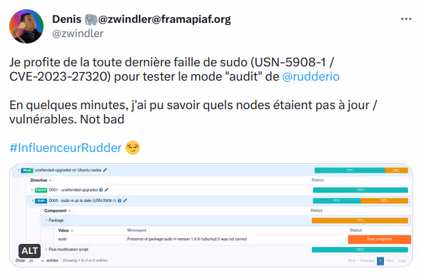 Quand j’ai commencé à tester Rudder, une CVE (de plus) venait de sortir sur sudo. Je voulais voir si Rudder était capable de vérifier si mes binaires sur mes ubuntu étaient patchés ou pas.