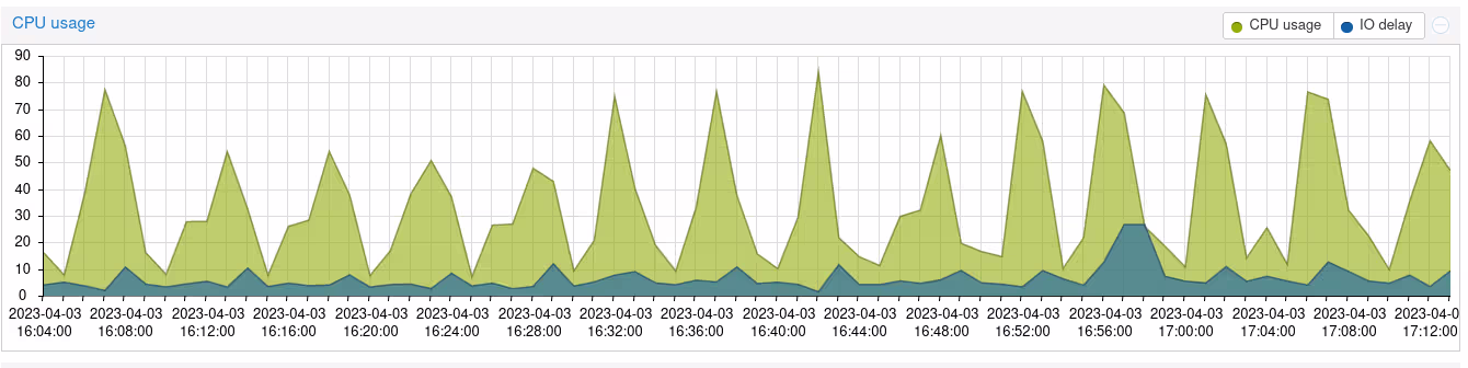 Rudder a beau être économe, multiplier les agents sur une machine aussi faible avait un coût difficilement soutenable sur ma machine, comme en témoigne le graphique CPU ci-dessous (mon serveur ne fait quasiment rien, c’est donc quasiment exclusivement de la charge Rudder).