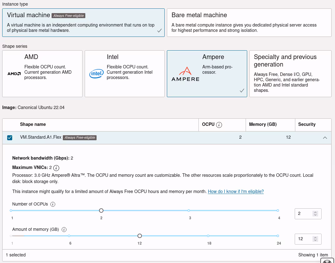 On va donc créer pour notre cluster Kubernetes 2 machines Ampere de 2 OCPUs et 12 Go de RAM. L’une sera notre control plane, l’autre notre worker.