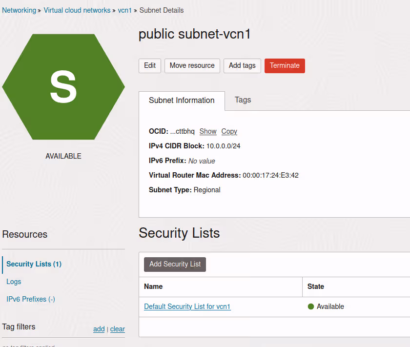 En plus de devoir configurer les firewalls côté OS, on va aussi devoir autoriser les flux internes sur le VCN. Dans la liste des VCN, cliquez sur le subnet “public”, puis sur “Default Security List for vcn1” tout en bas.
