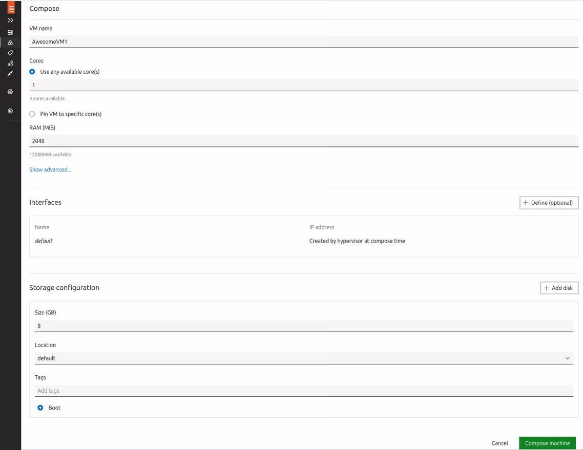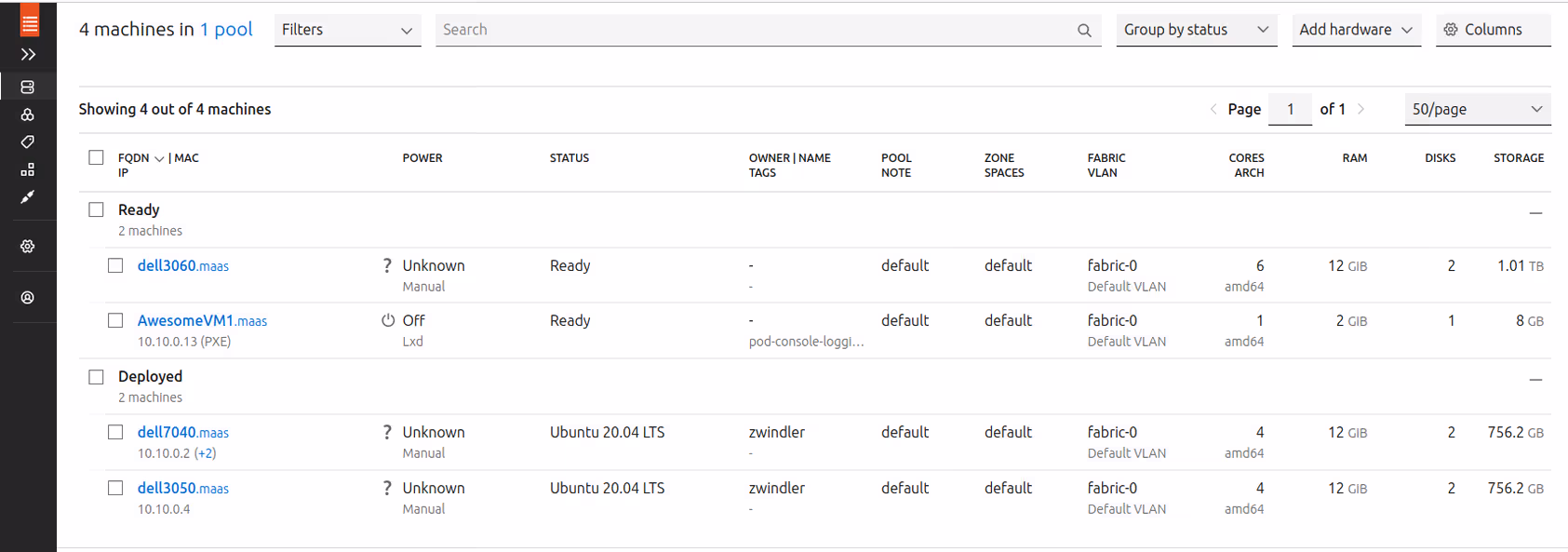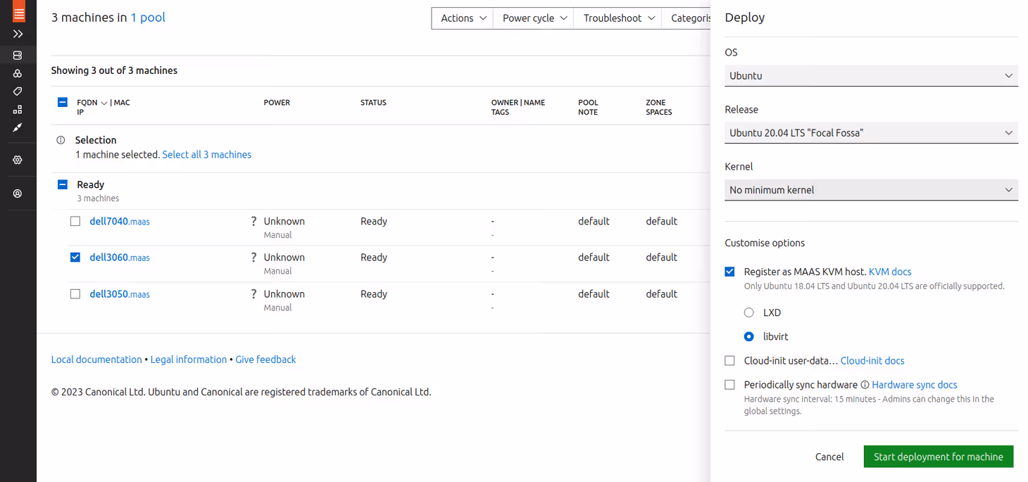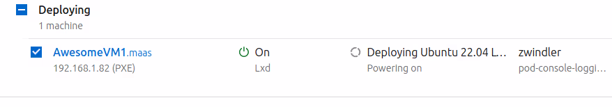 On peut ensuite aller dans virsh/LXD (selon ce qu’on a choisi) et poper des VMs depuis l’interface de MAAS.