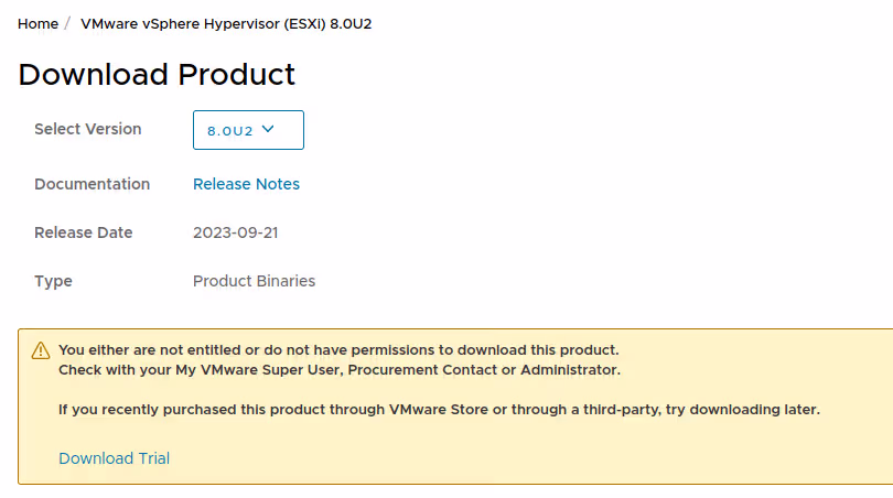 Pas de bol, j’avais fait mes premiers tests sur VMware ESXi 8.0u1, et j’ai voulu récupérer la u2, mais voici ce que me dit VMware