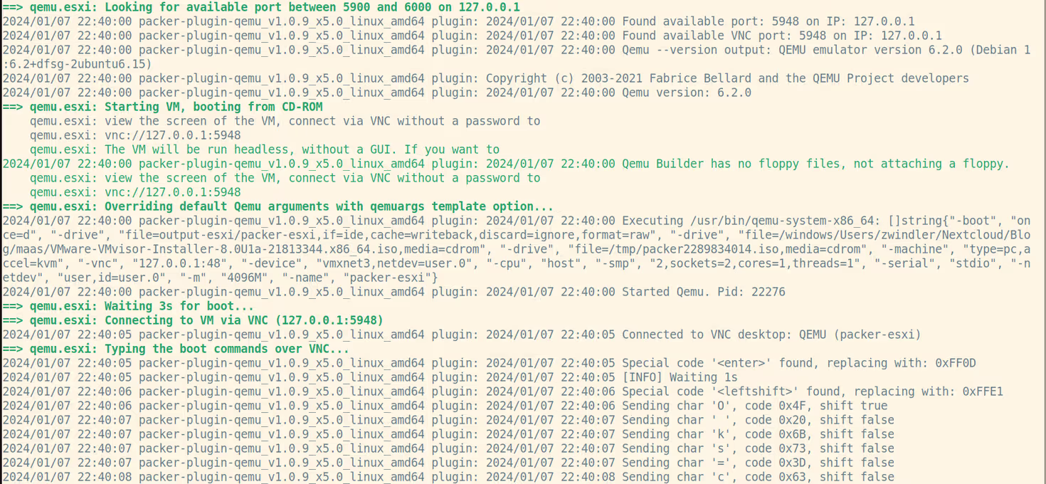 sudo PACKER_LOG=1 packer build -var 'vmware_esxi_iso_path=../../VMware-VMvisor-Installer-8.0U1a-21813344.x86_64.iso' .