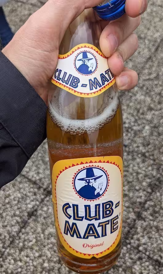Étant un peu stressé, je voulais avoir bien le temps de manger. Nous avons donc fait une queue interminable pour un burger pas terrible (et même pas de frites). Un peu frustré, je me suis rattrapé sur le club maté, qui m’a redonné la patate :D.