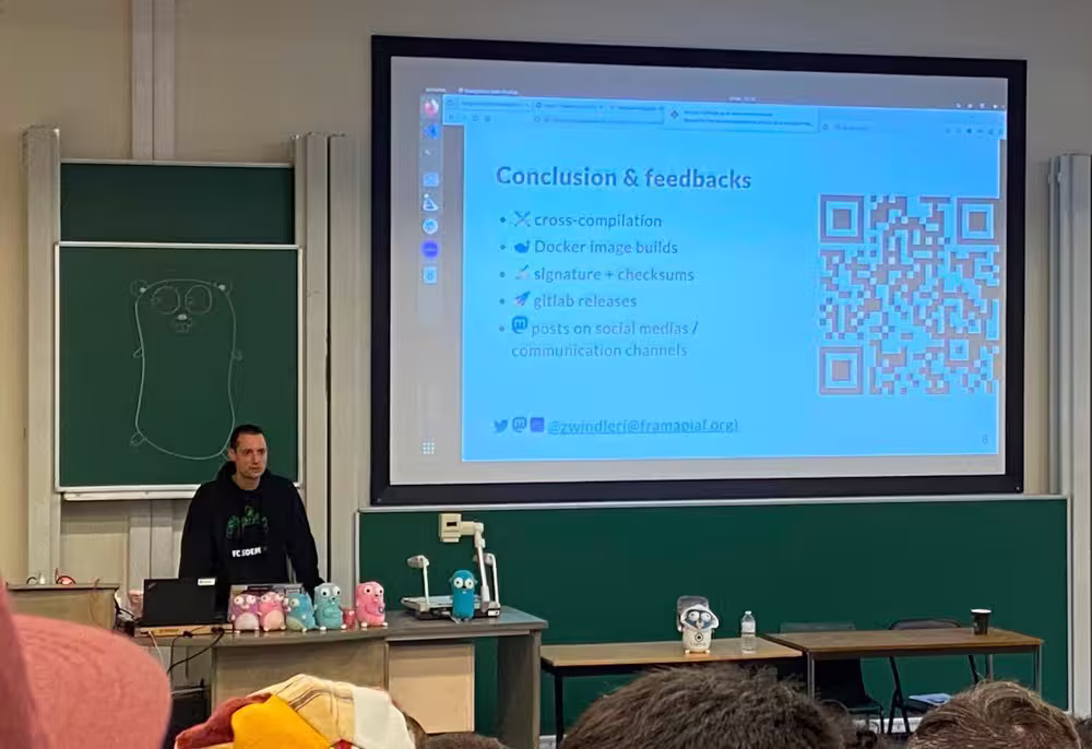Contrairement à l’an dernier par contre, cette année, j’étais speaker ! J’ai refait (en anglais) mon talk sur GoReleaser. J’étais un peu stressé, car je suis relativement débutant en Golang, surtout par rapport au niveau de la room.