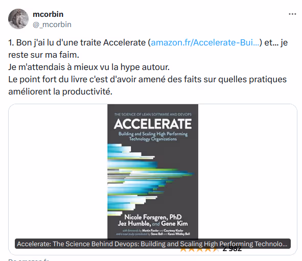 J’ai discuté avec des collègues, qui m’ont convaincu de NE PAS lire Accelerate. En effet, sans l’avoir lu, je baigne depuis suffisamment longtemps dans des organisations qui en sont grandement inspirées pour en connaître les grandes lignes, ce que m’a confirmé d’ailleurs la lecture d’un résumé.