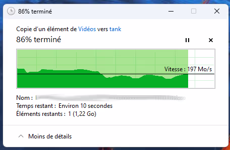 Des copies de fichiers en local (depuis le disque NVMe du système vers le pool ZFS) donnent des résultats similaires.