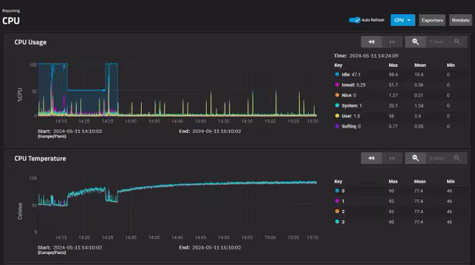 Pour que les tests soient les plus représentatifs possibles, j’ai laissé tourner 45 minutes le temps que ça se stabilise :