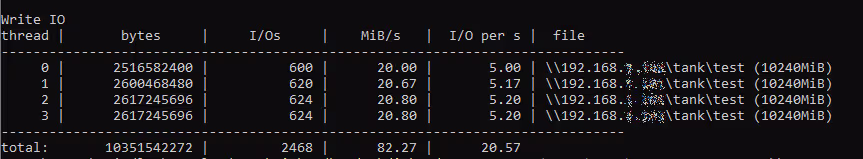 .\DiskSpd\amd64\diskspd.exe -c10G -d30 -b4M -h -o32 -t4 -r -w100 \\192.168.aaa.nas\tank\test