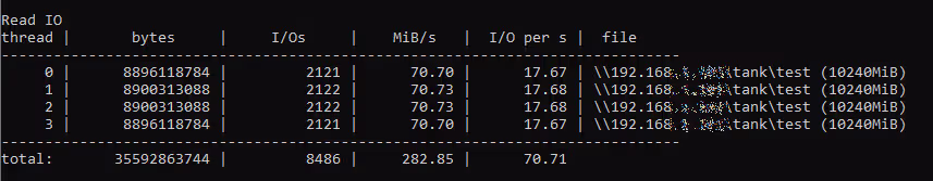 .\DiskSpd\amd64\diskspd.exe -c10G -d30 -b4k -h -o32 -t4 -r -w0 \\192.168.aaa.nas\tank\test