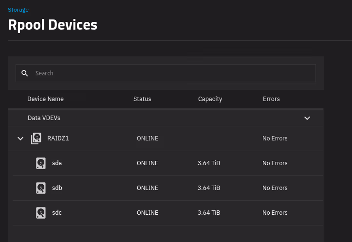 Dans mon cas, après avoir testé un premier pool avec 4 disques que j’avais en spare, ZFS m’a très rapidement prévenu que quelque chose n’allait pas avec mes disques. Après un SMART approfondi, je me suis retrouvé avec 2 disques HS… J’en ai acheté un de plus et créé un pool avec “seulement” 3 disques (au lieu des 4 prévus initialement).