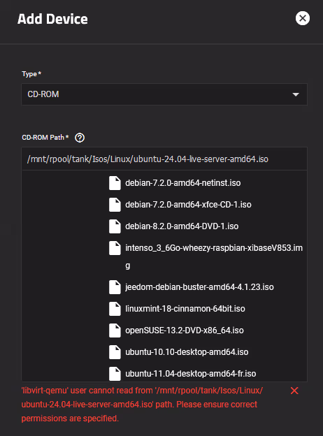 Deuxième coup d’arrêt, les droits… libvirt n’a pas le droit d’accéder à l’ISO. C’est dommage…