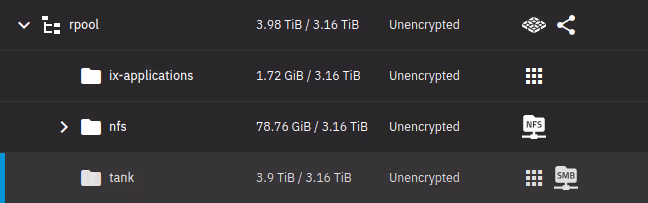 Toute la gestion des partages et notamment des droits sur les fichiers et assez peu “user friendly” sur TrueNAS. C’est vraiment une déception personnelle de ce côté là, j’ai dû bidouiller pas mal pour que les utilisateurs ET les apps puissent accéder correctement à mon stockage. J’ai même dû corriger quelques permissions à la main à coup de chmod. Bref.