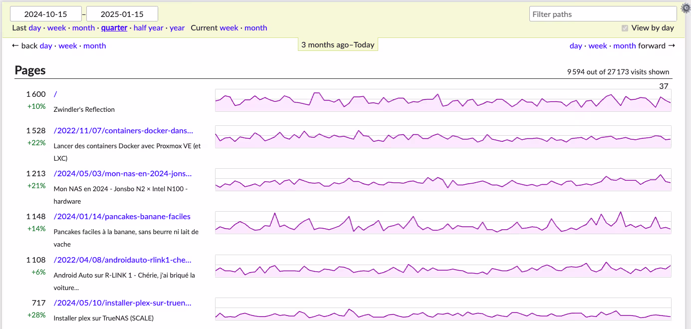 C’est moche, mais ça marche. Et ça me permet de savoir les articles qui marchent le mieux, comme ma fameuse recette des pancakes à la banane sans PLV (j’en parlais dans l’article Dans le rétro de 2024 : trop de side projects)