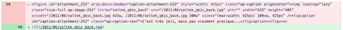 Lorsque j’avais entamé la migration Wordpress vers Hugo en 2020, je n’avais pas nettoyé tout le code qui avait été importé de Wordpress. Pas mal d’images restaient dans un format bâtard non-markdown, avec des balises HTML chelou.