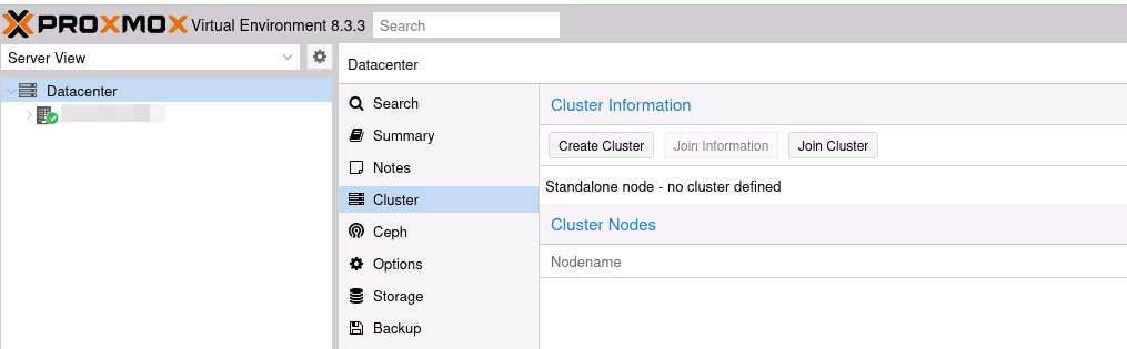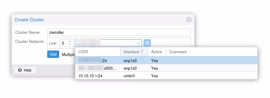 Note : ici, c’est simple, je n’ai que ma carte réseau, donc il n’y a pas de doute sur l’interface à utiliser. Cependant, dans le cas d’un serveur avec plus d’interfaces et plus de bridges (ou des VPNs comme on a dû le faire jusqu’en PVE 6), il faut bien choisir quelle interface sert au clustering.