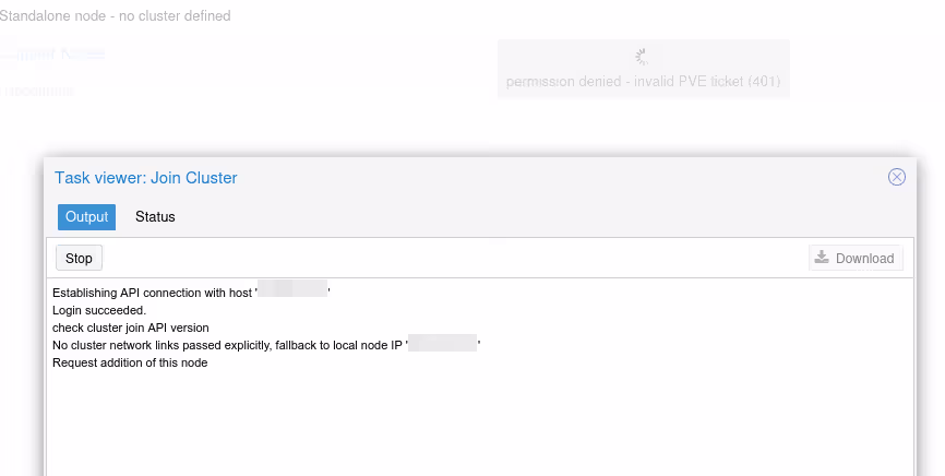 Petit coup de flip normalement, une fois que le node va rejoindre le cluster, vous allez perdre la main sur l’interface web et avoir un message d’erreur “401”. C’est “normal”, quand le serveur rentre dans le cluster, des services sont redémarrés et on passe d’un mode standalone à un mode clusterisé…
