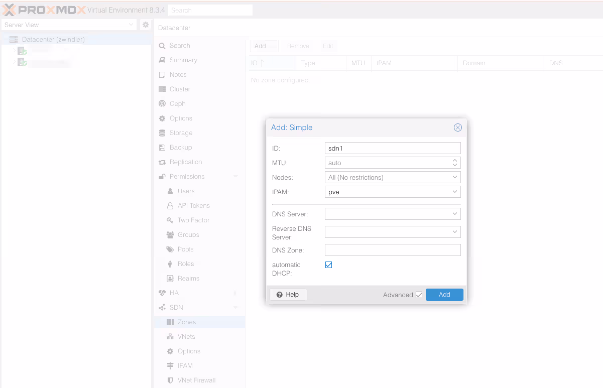 Dans le menu SDN/Zones, ajouter une zone de type “Simple”. Il existe des zones plus complexes qui seront utiles dans des contextes de production avec des LANs non triviaux (VLAN, VXLan) mais dans notre cas, la Simple est suffisante.