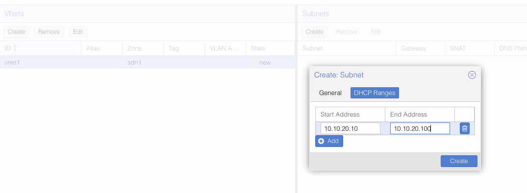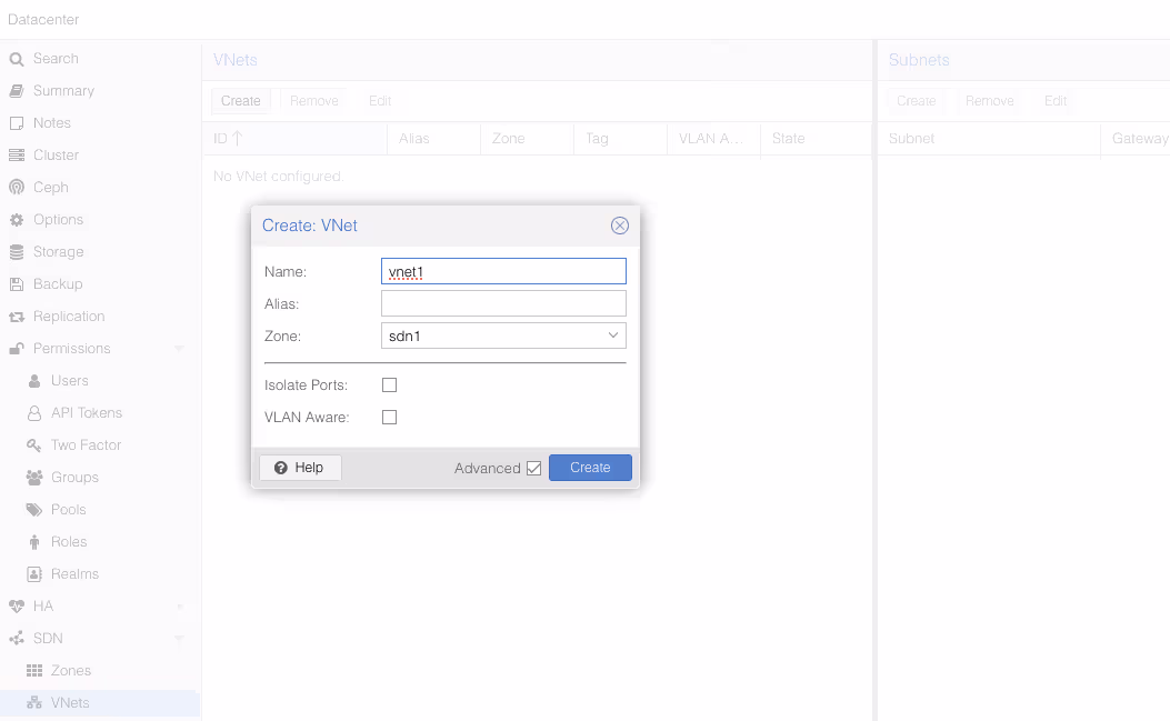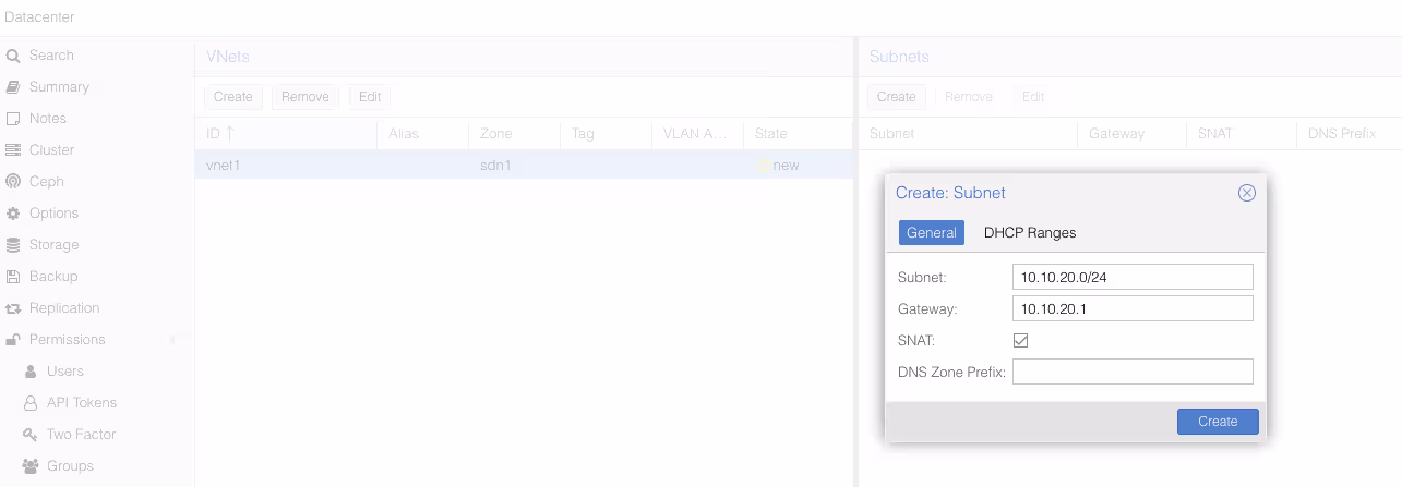 Une fois que vous avez validé, allez dans le sous menu SDN/VNets, cliquez sur le bouton “Create” pour créer un réseau virtuel, puis le sélectionner une fois créé pour créer un sous réseau.