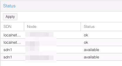 Pour déployer ces modifications, on doit retourner dans le menu SDN du début, et cliquer sur Apply. Deux lignes “sdn1” (une pour chaque serveur, en vrai) devraient apparaitre.