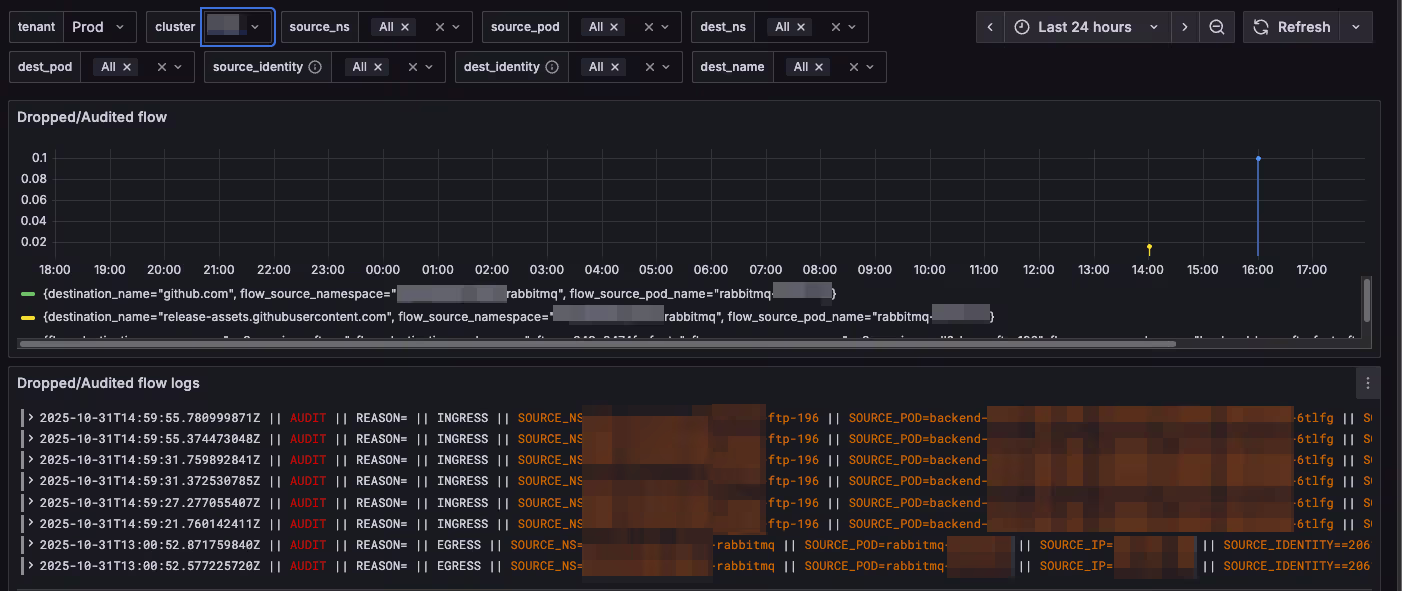 Comme toute bonne équipe “ops” qui se respecte, nous monitorons/loggons les flux réseau de notre cluster Kubernetes avec Hubble pour une analyse ultérieure et de l’alerting. Nous (en particulier mon collègue Nicolas Nativel) poussons tous les flux AUDIT et DROPPED vers un dashboard Grafana pour pouvoir rapidement repérer quand quelque chose est bloqué et décider :