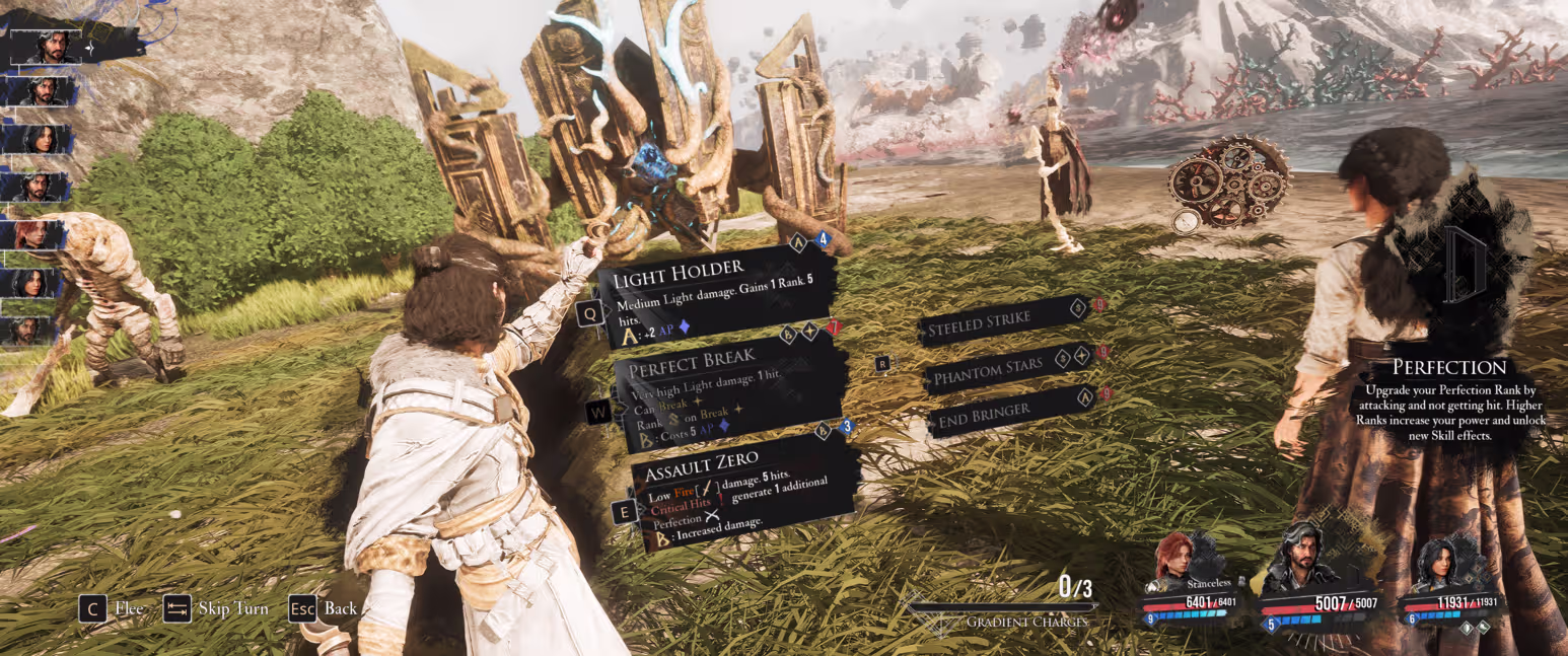 Pour ceux qui l’ignorent encore, le jeu est un RPG qui repose sur un mécanisme de combats tour par tour en 3v3 (max). Chaque personnage a des capacités et même un style de combat qui lui est propre. On débloque des capacités actives au fil de l’eau. Lorsque c’est le tour de l’ennemi, il faudra parer ou contrer les attaques adverses en appuyant sur un bouton “au bon moment”. C’est cette partie qui me faisait très “peur”.