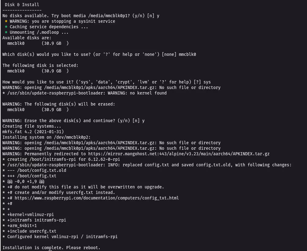 À ce stade, Alpine tourne entièrement en RAM (image “live”). Pour l’installer définitivement, nous allons utiliser l’utilitaire setup-alpine dont les options sont décrites dans wiki.alpinelinux.org/wiki/Installation.