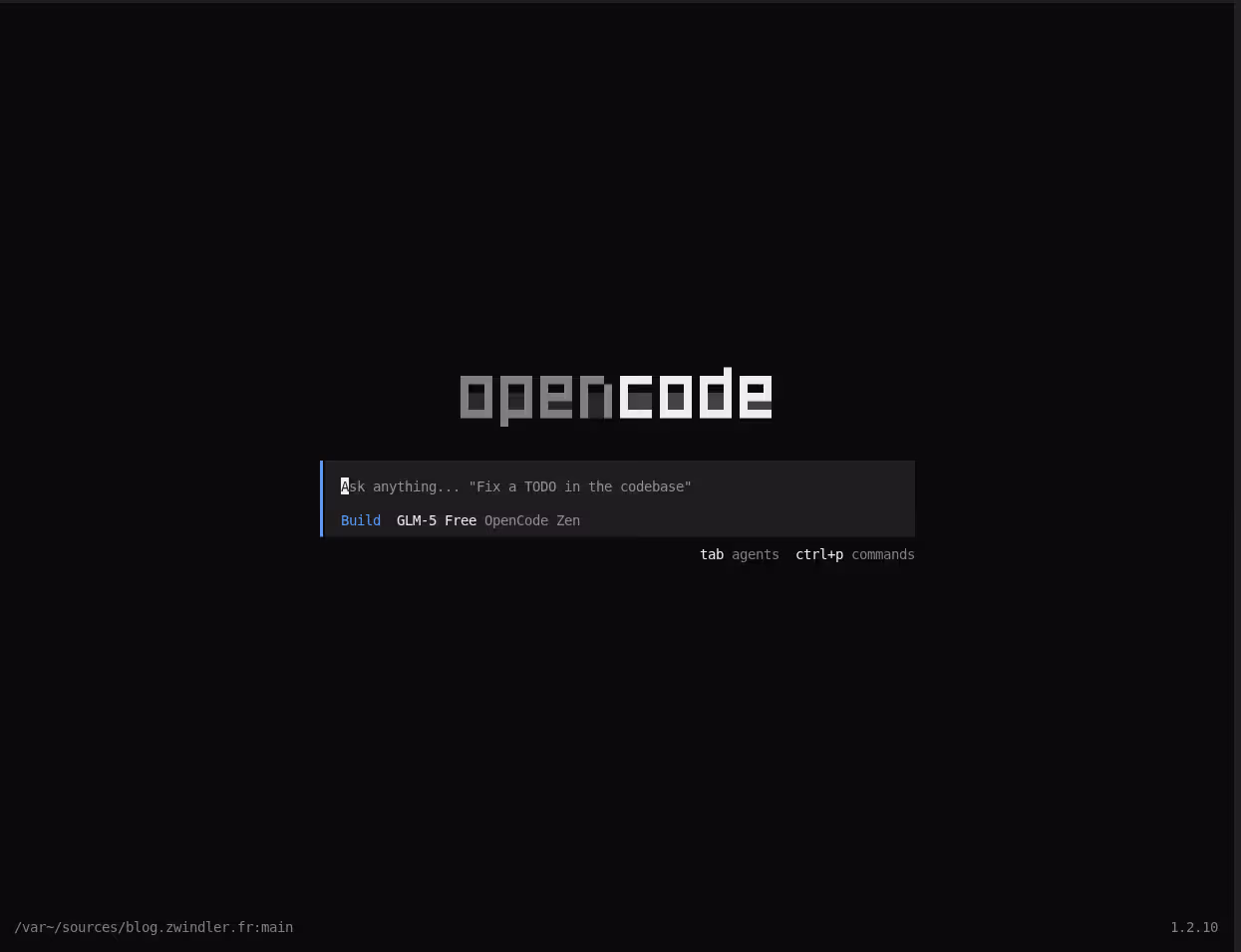 On (Pierre surtout) m’a conseillé Amp Code pour du perso, notamment parce que de base, il y a un tier gratuit avec un certain nombre de tokens et que si on n’est pas trop gourmand, c’est assez efficace. J’ai préféré n’en faire qu’à ma tête et tester plutôt sur OpenCode, qui a l’avantage d’être plus flexible sur les providers de LLM et la consommation de tokens. Il est d’ailleurs possible de profiter de modèles locaux (gratuits, donc) ou des modèles inclus gratuitement (en tout cas pour l’instant) tels que GLM 5 Free, qui est plutôt bien placé dans les modèles de dev (surtout, c’est gratuit…).