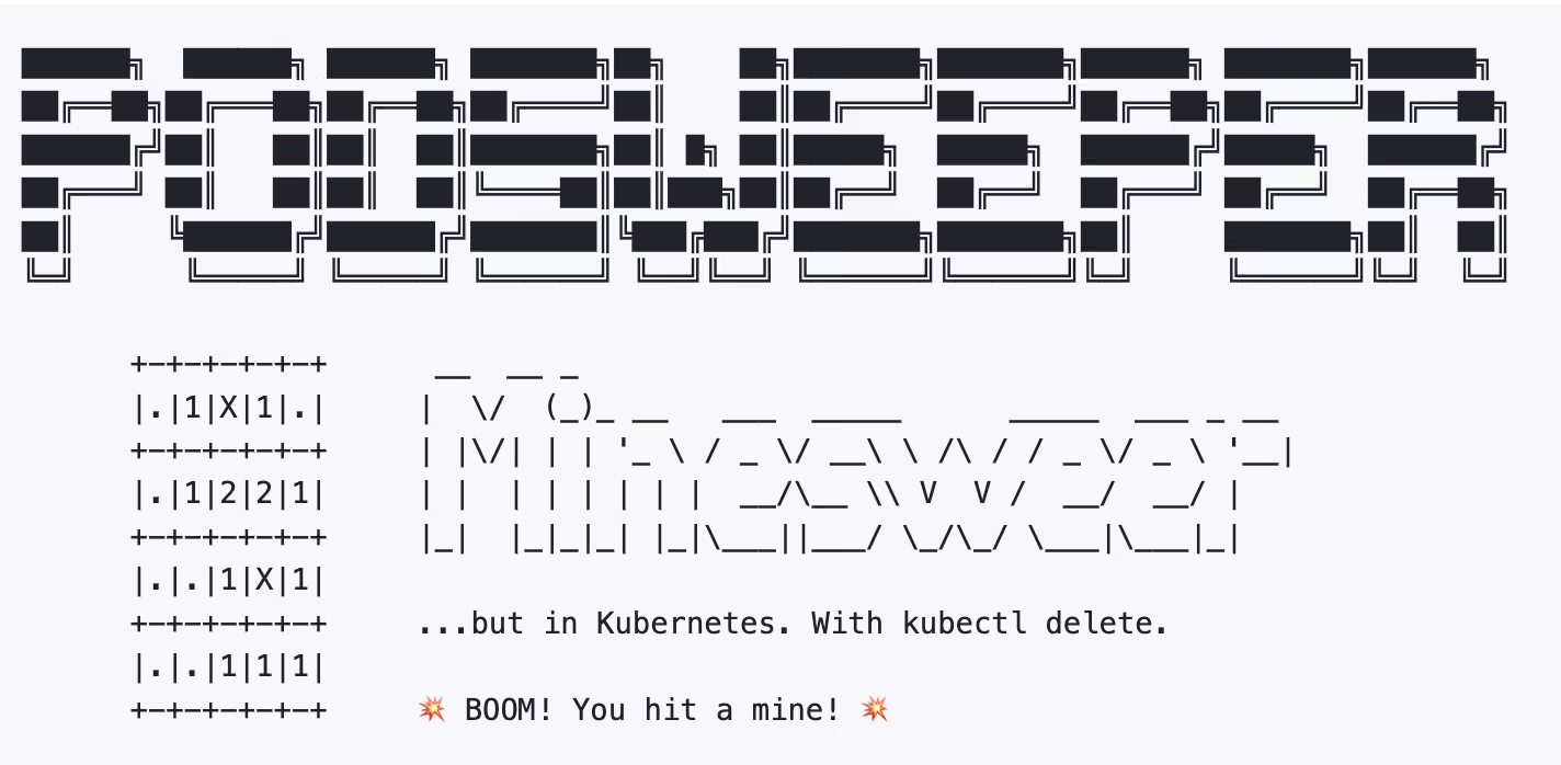 Au lieu d’une grille visuelle où on clique sur des cases en espérant ne pas tomber sur une “mine”, on a une “grille” virtuelle où chaque case est un Pod et le clic est un kubectl delete.