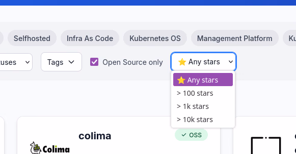 J’ai ajouté un filtre par nombre d’étoiles GitHub qui n’apparaît que quand le filtre “Open Source only” est activé. Plutôt pratique pour identifier rapidement les projets les plus populaires (> 100, > 1k, > 10k stars).